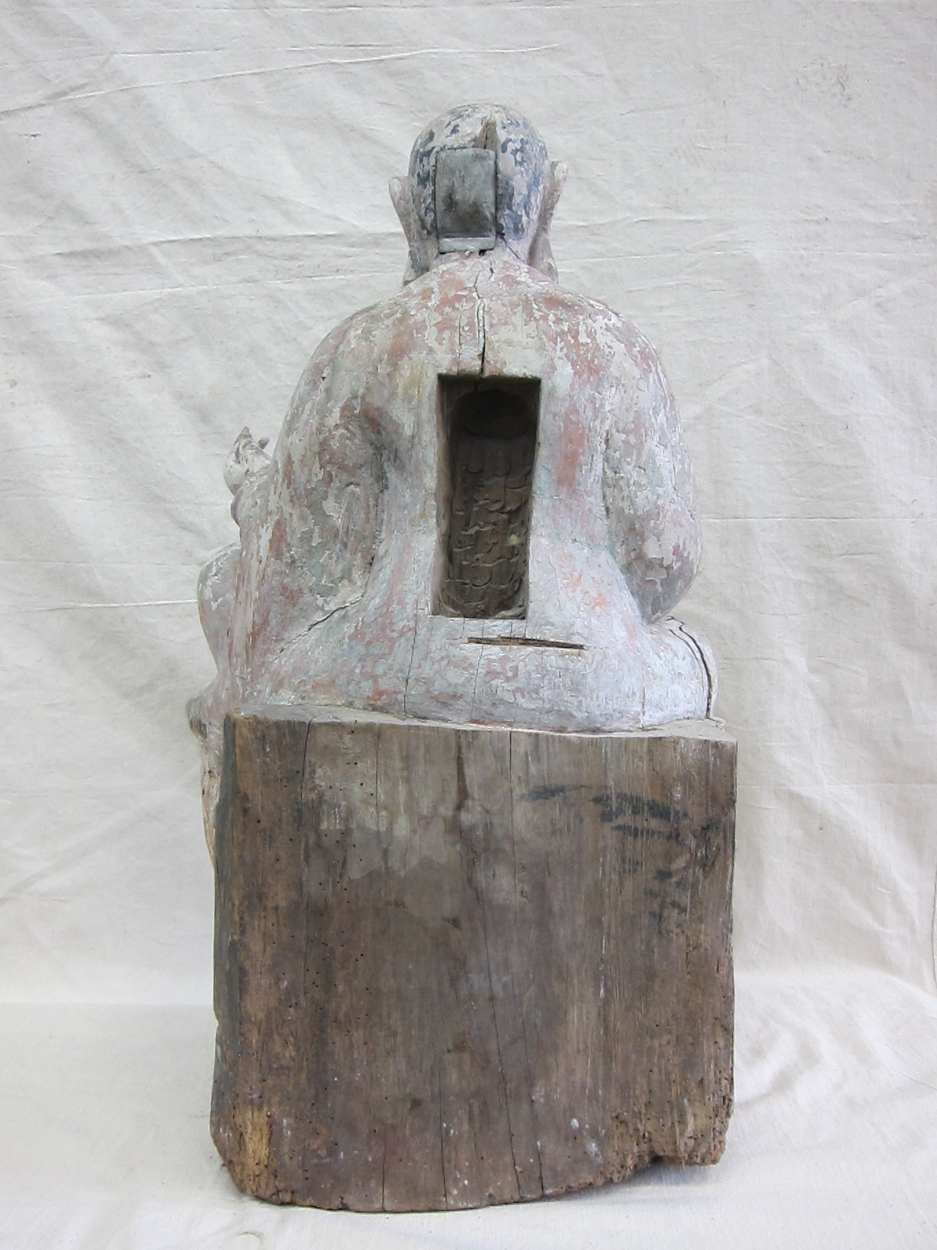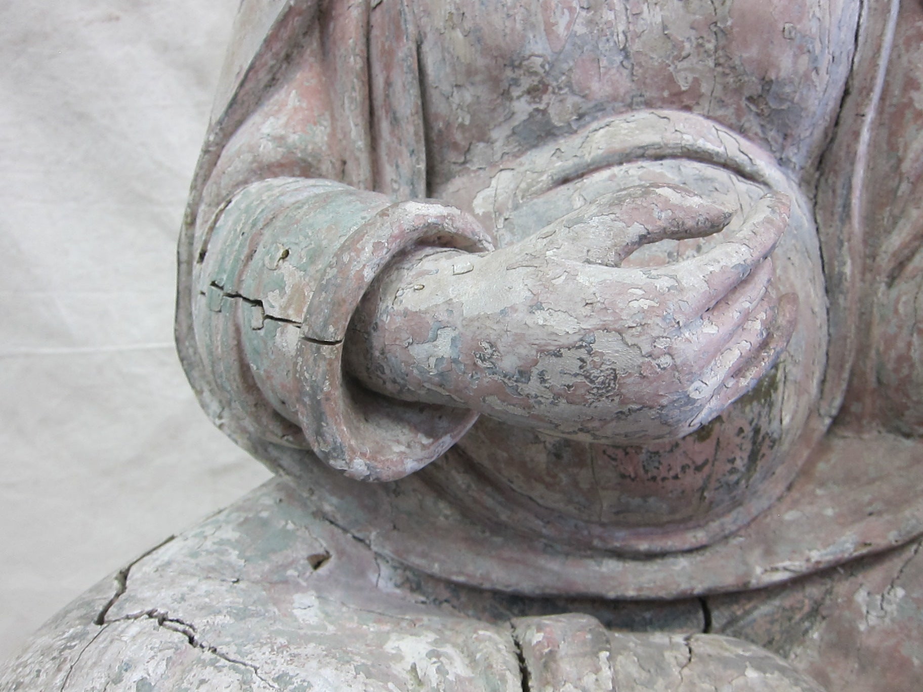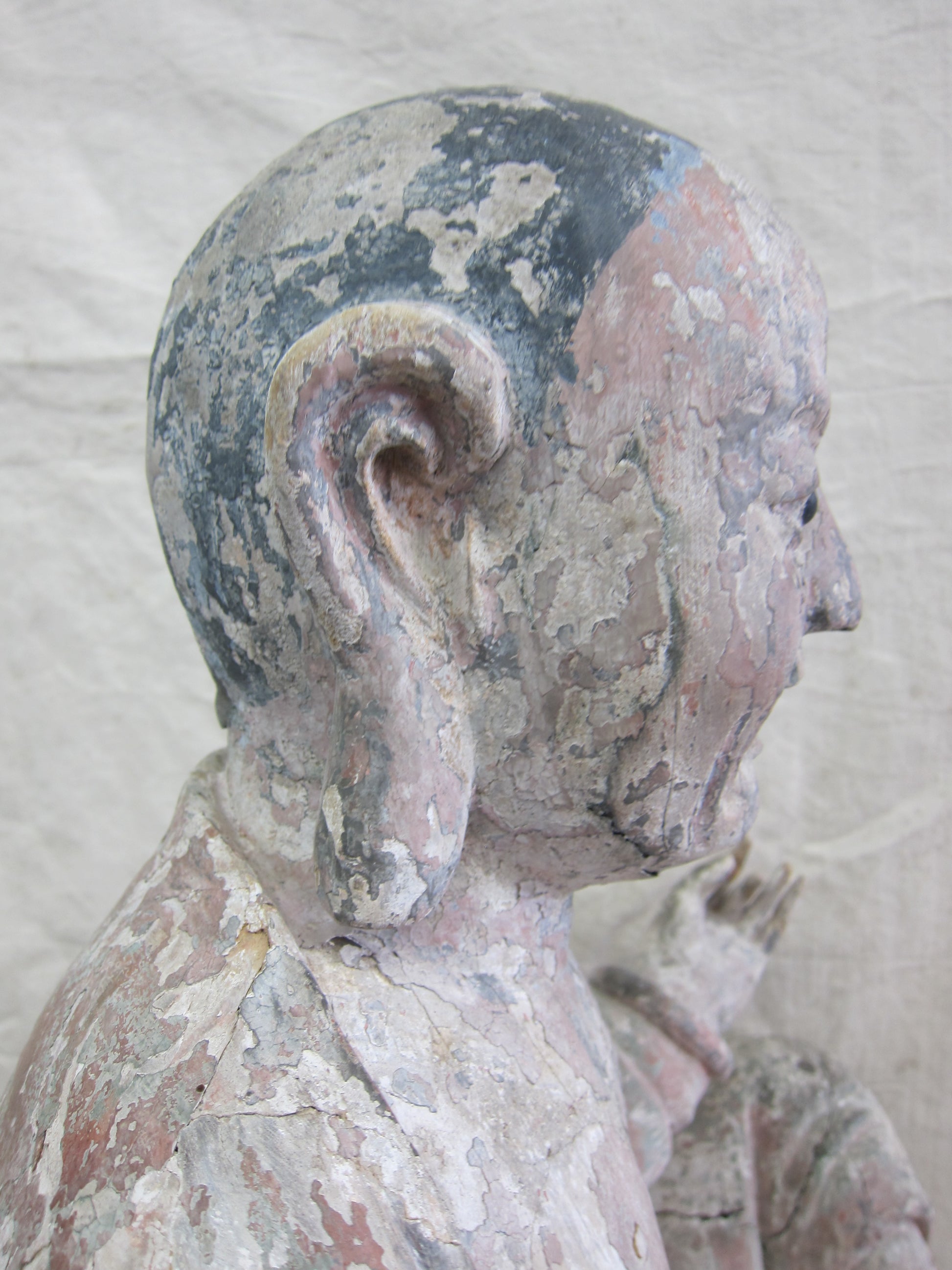 17th century Buddhist Lohan wood block carving. Large-scale carving of Chinese Lohan. Remnants of pigments, cracks to wood, having wooden pegs in the construction. Condition is good based on age. Lohan are the eighteen original followers of the Buddha who have followed the eightfold path and attained the four stages of Enlightenment. They have reached the state of Nirvana and are free of worldly cravings. In contemplation of all things this representation is believed to be Tanshou Luohan. He was a prince but became a monk. After meditation he would raise his hands like Lifting the Sky. Carved by monks in the 17th century filled with blessings. Each blessing placed inside the carving using wooden pegs. Each peg hammered into this statue. This is rare folk art Buddhist statue.