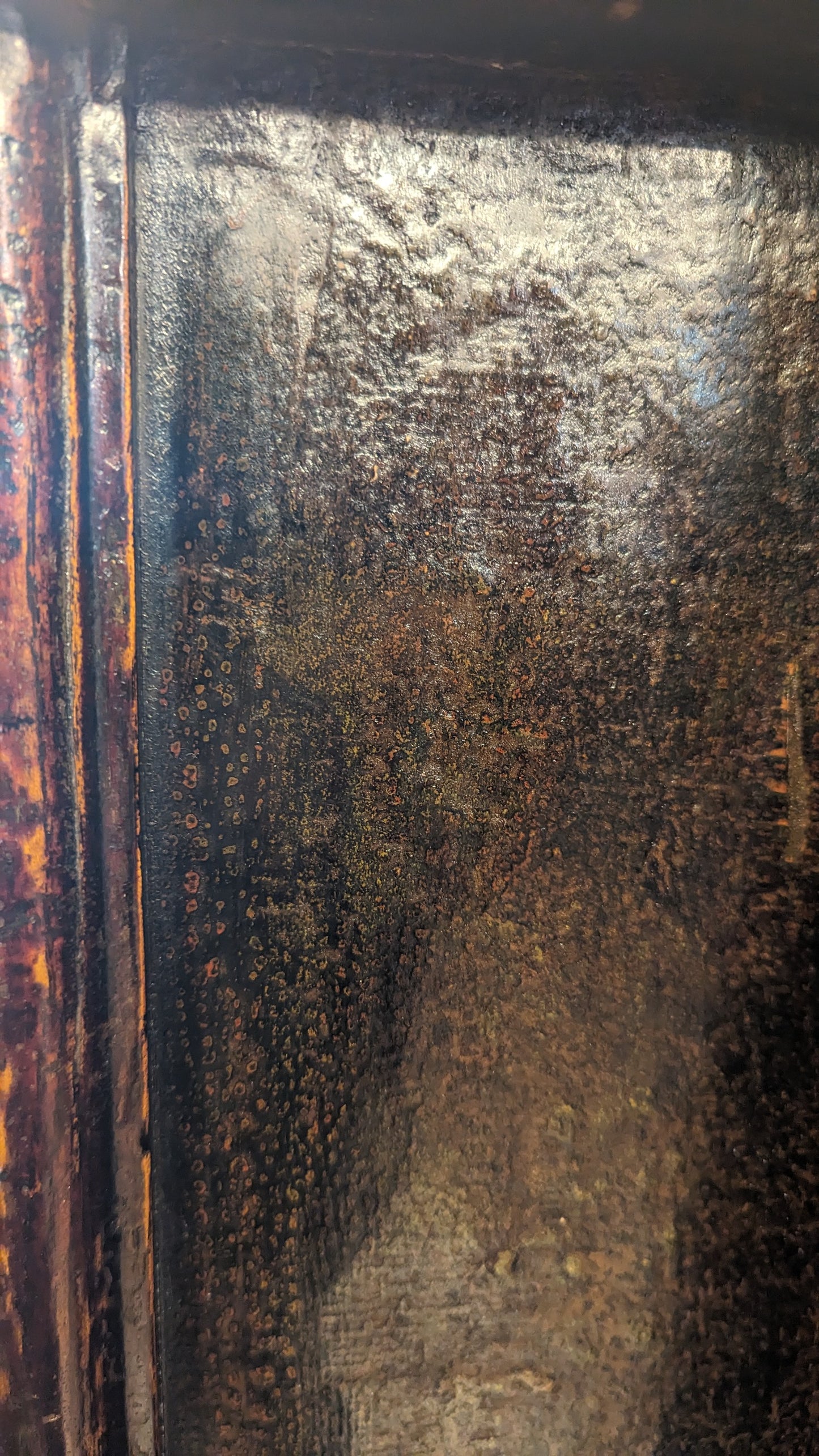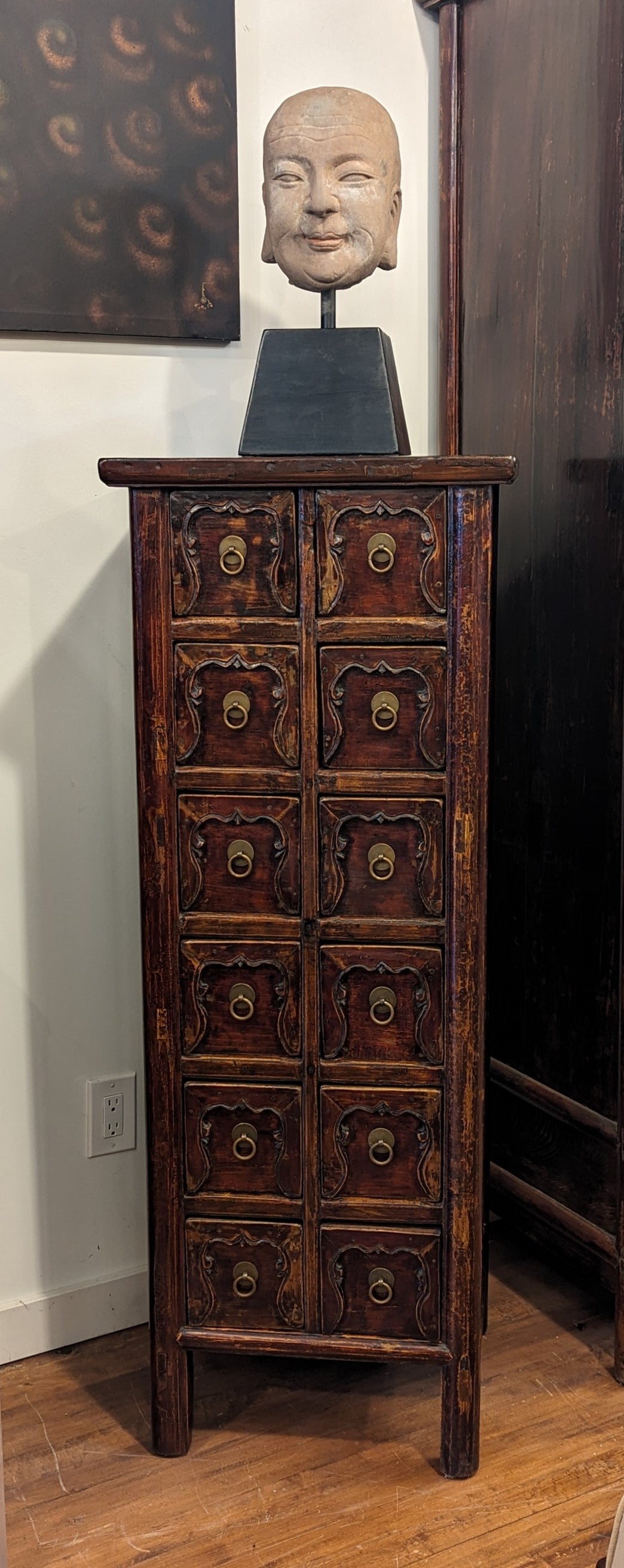 19th Century Apothecary Cabinet Chest of Drawers. A Qing Dynasty Apothecary Chest of Drawers from Northern Shanxi China. The hand hued wood has a charming character all its own and is evident throughout the piece. The drawer plates have carving of open curtains suggesting the contents of the drawers to be very special. Stylistically Shanxi with a panel top soft waist detail over hanging eased rounded legs, constructed of northern Elm wood with tree sap lacquer. The sides of the case have beautiful leather like patina which is a result of the tree sap lacquer aging. A wonderful piece decoratively and useful with 12 drawers each having an internal size of 5Wx5.5Dx11.5L. The top is perfect for display of sculpture or art piece and can support 200lbs without issue. In very good condition.