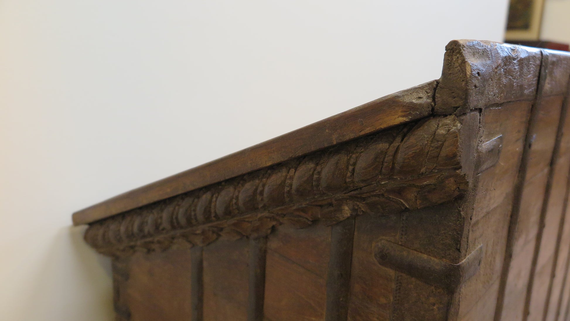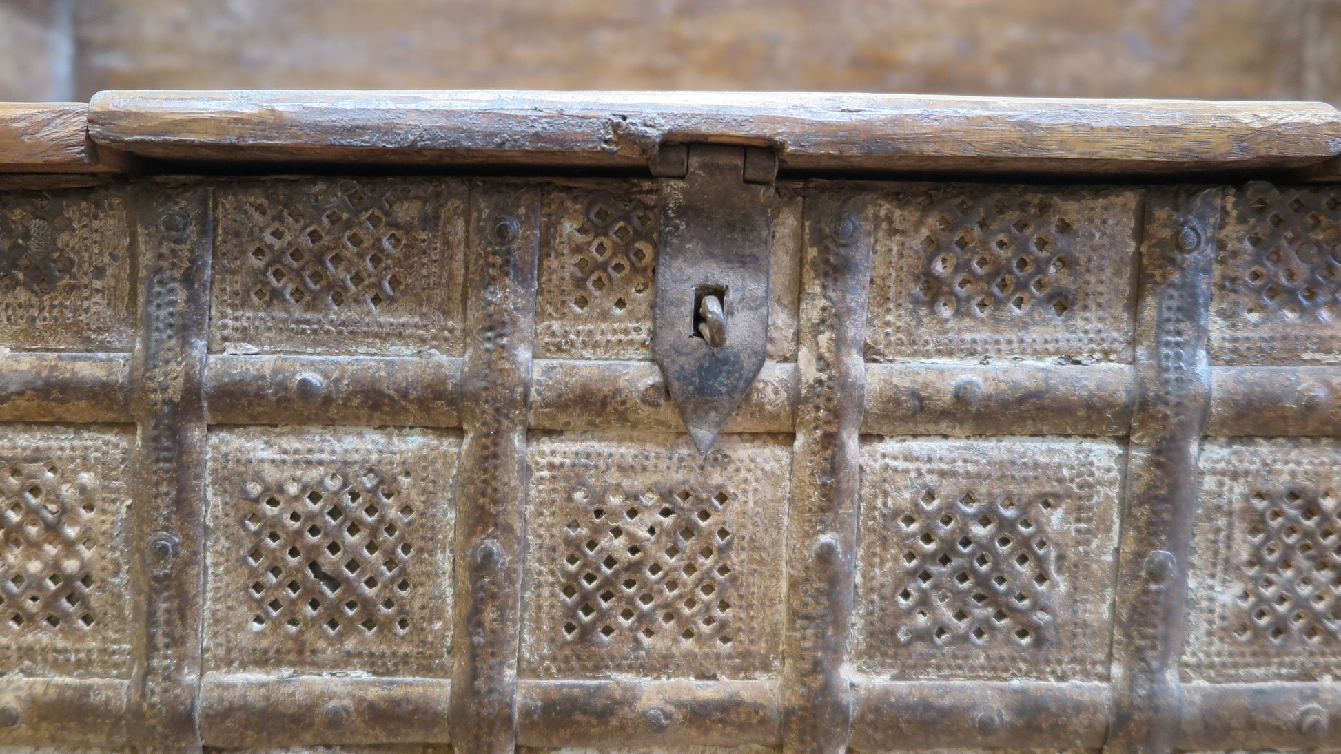Antique Rustic Indian Bench Trunk, Dowry trunk. This bench seat said to be a old Tax collectors bench from 1800. Serving as both seat and a storage trunk made of old growth teak with iron work all round front and back. Spiral carved railing under the arm rest. Can accommodate blanket or foldable items such as linens inside. The seat is deep and makes a good bench seat. A cushion cold be added for additional comfort. Very solid and strong. In good rustic condition. The teak wood is old growth being very dense. Great for a hall bench.