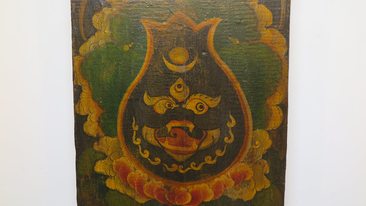 A Tibetan Painted Panel Door. Canvas over wood painted using mineral pigments and polychrome. Tibet has little resources and old wood is reused as platforms for Buddhist art. This representation of the process of life creation showing a Mahakala face contained within the outline of a lotus flower bulb. Buddhist Mahakala is the God of Time, Maya, Creation, Destruction and Power. The Lotus bulb represents proliferation of life. Moon above the sun rests atop the third eye of mystical intuition and insight—an inner vision and enlightenment beyond what the physical eyes can see. Below the mouth is a beard of fire representing life symbolizing the power of creation to destruction, a protector. The bottom of the painting represents the beginning of life as nature. The Sun and moon in this context is symbolic of wisdom and compassion, the emblem of balance and harmony. The process of life contained within the Lotus bulb bloom the seeds of life. In all this painting is presenting the image of powerful protection in life and after life being able to see over all things as we are born from the earth to move through life beyond atmosphere back to energy into a next life. Which is the top of the painting from the tree tops to the clouds, to the rainbow of colors flowing upward. The rainbow body which is considered the "penultimate transitional state of meditation in which matter begins to be transformed into pure light." This is the highest state attainable in the realm of samsara. A wonderful unique Tibetan art piece. In good condition, as pictured, weathered from time and use. Has a wire on back for wall hanging.