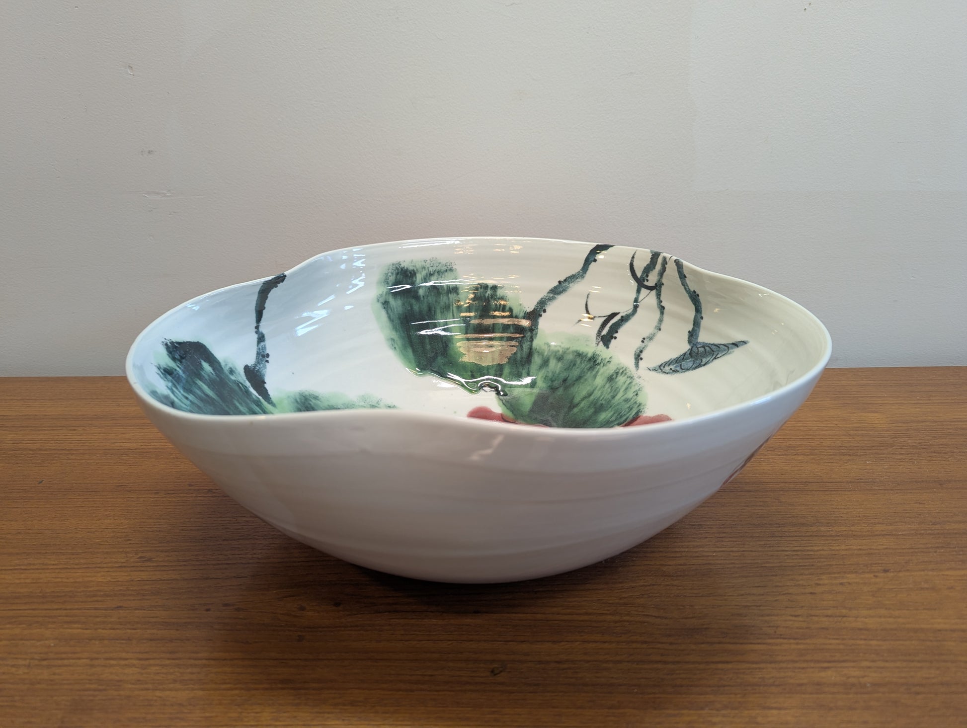 Artisan Porcelain hand formed & hand painted high, quality fine porcelain. Wonderful shape abstract shape. Artist signed with poem. This is a one of kind art piece of Porcelain, can be used everyday, holds water.