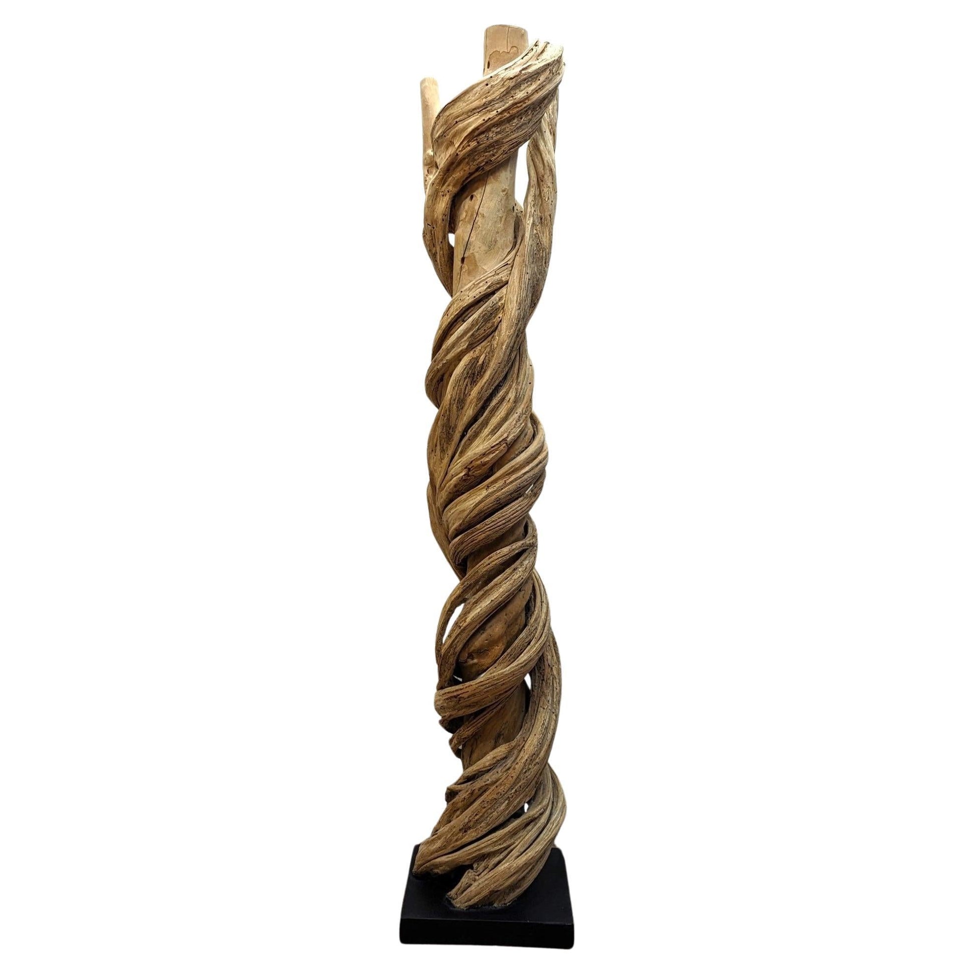 Beautiful natural Liana vine sculpture surrounding Acacia tree. Organic naturally occurring Liana vine growth coiled around an Acacia tree. Naturally weathered recovered from fallen trees in Rainforest of Northen Thailand. Cleaned, cured lightly sanded mounted for display. A wonderful naturally formed organic sculpture. This art piece is a fantastic natural element created by nature, a sculptural piece of art. A stand alone art object that adds an organic natural element into any décor. Naturally monochromatically toned warm color beautiful in any setting.